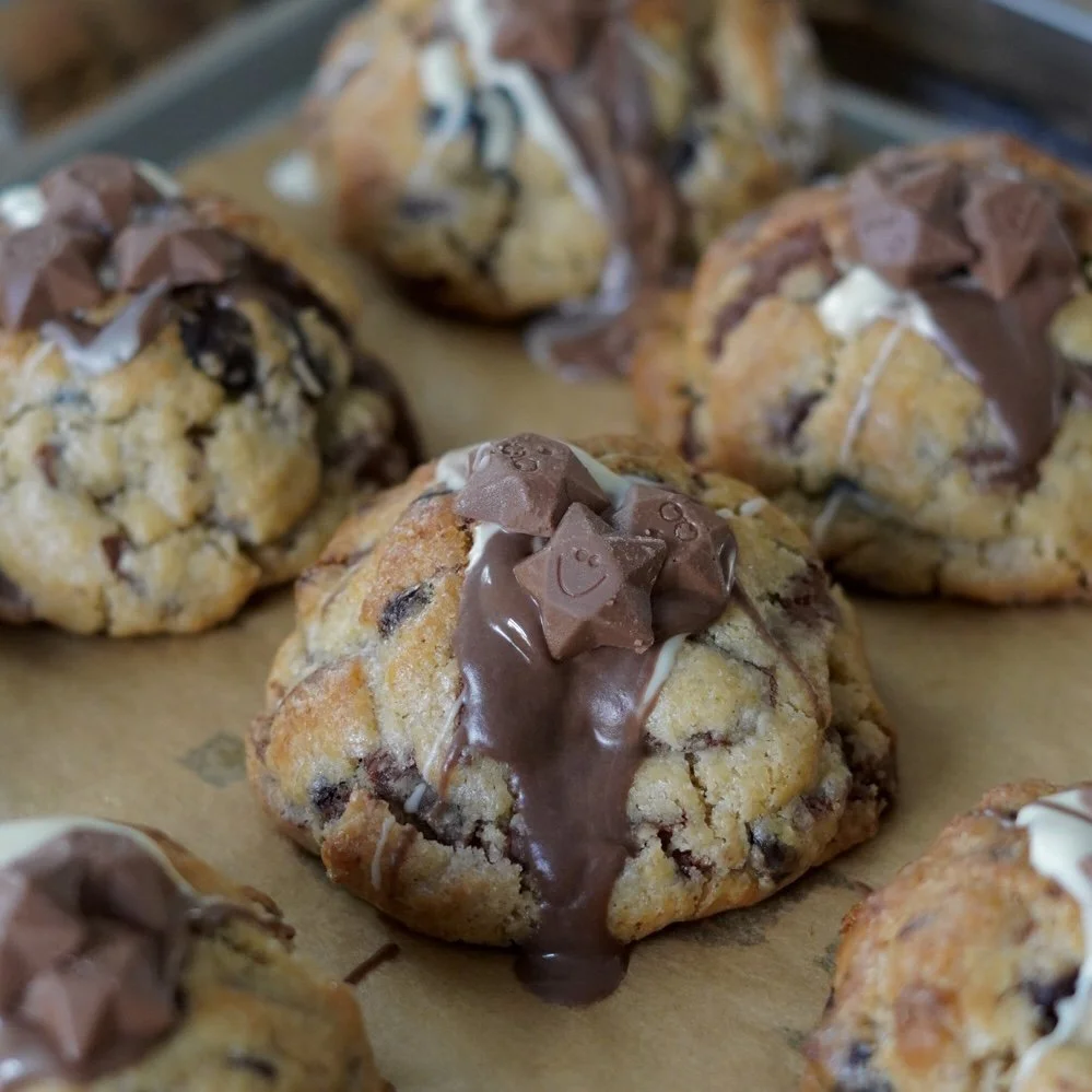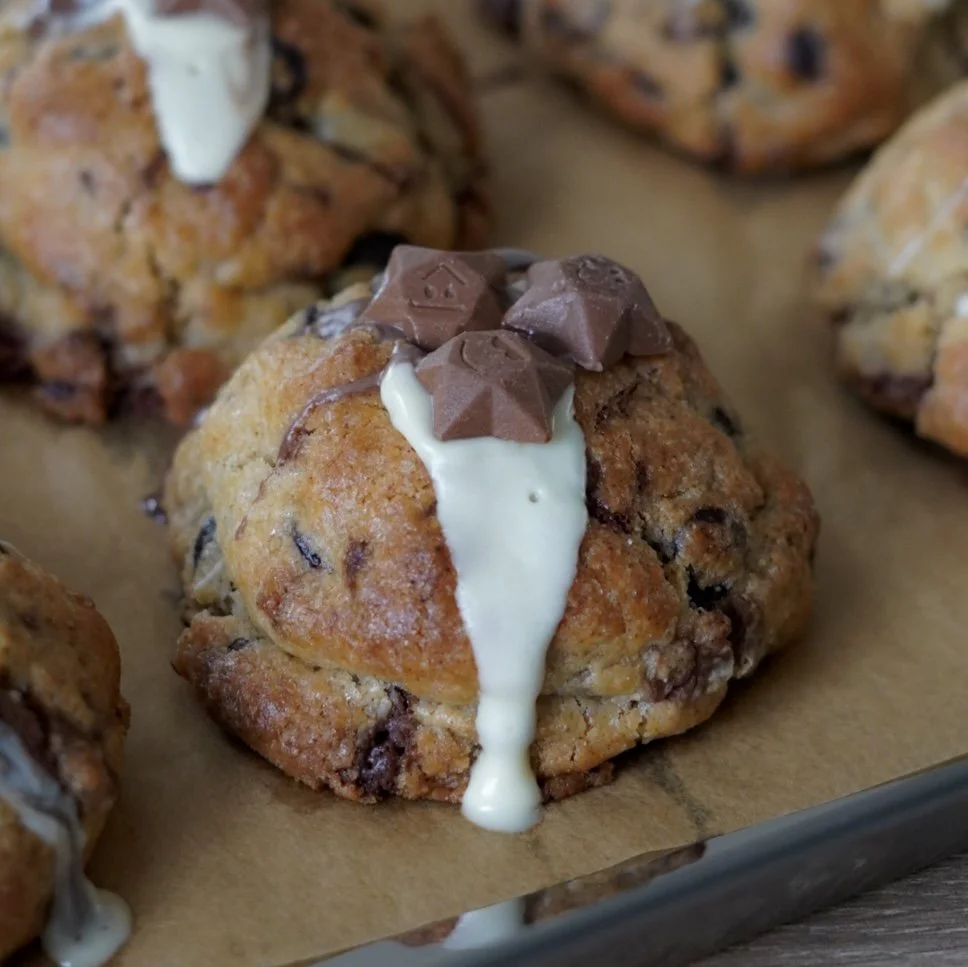 A chunky NYC style cookie, stuffed with white chocolate and milk chocolate spread, topped with magic stars chocolate.