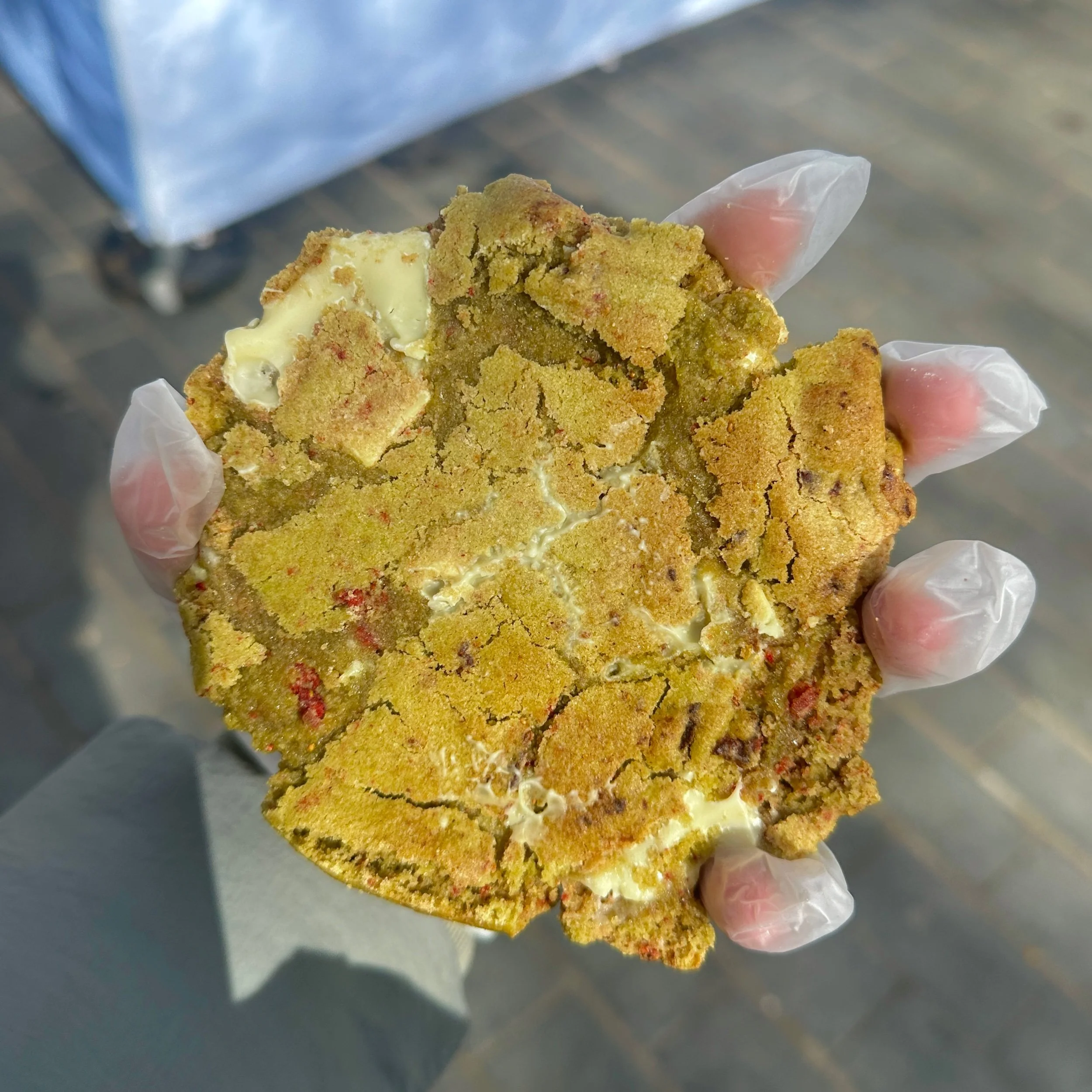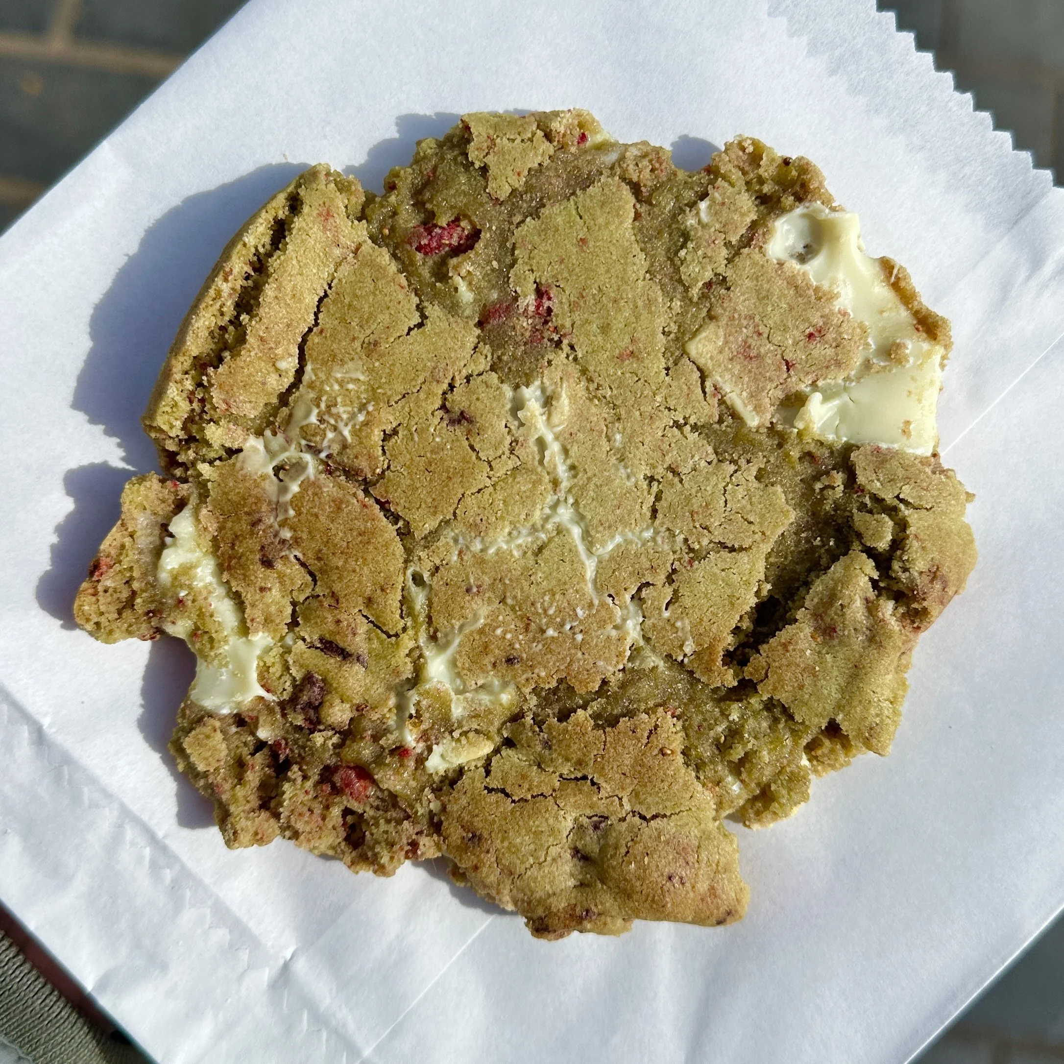 A flat, matcha infused cookie, packed with white chocolate and freeze dried strawberries. A PERSONAL FAVOURITE!